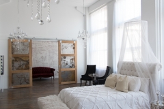 Tons of room to move around in here! This studio has a romantic feel with a white tufted bed and canopy.